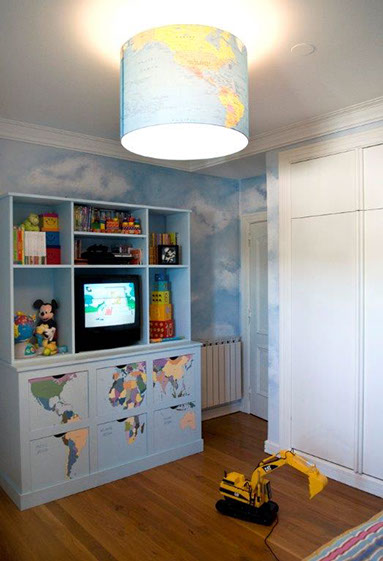 In this room shared by two brothers I painted a world map on the wall which was inspired in a Designers Guild fabric. It works as a living geography lesson in full colour! These two brothers can travel whenever they want and go around the world countless times without leaving their room: all they have to do is look at the wall and trip