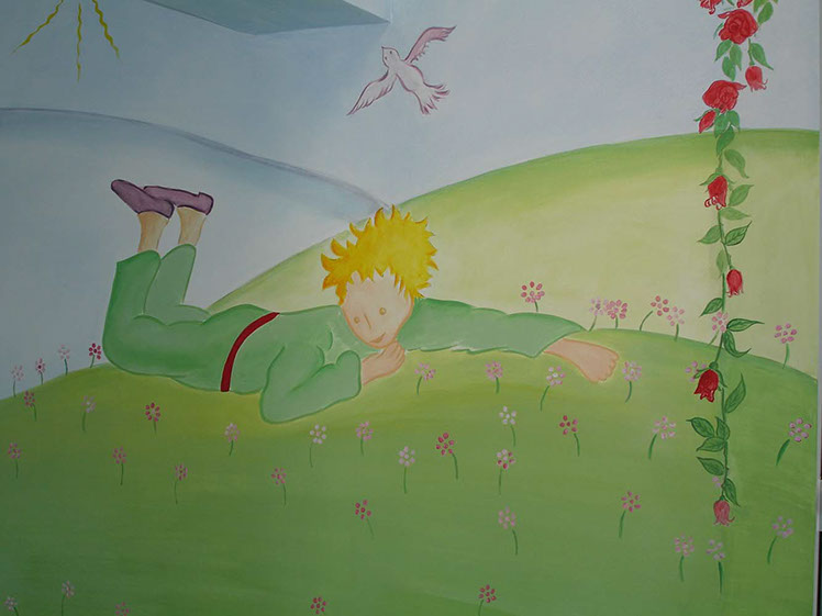 This time I painted a nursery school and the theme was once again " The Little Prince " because the nursery is called The Good Little Prince , and the owner is passionate about this book and its universal message. It was a project that I loved to do, because I love to paint for children and there is nothing better to paint a space where they spend many hours a day. The only condition imposed by the owner of the day care was that these princes had to be smiling for the children.