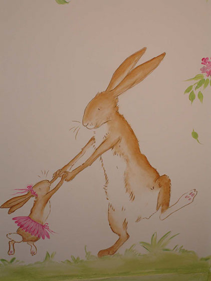 In this nurseery, I was once again inspired by Beatrix Potter's books. I picked a few cenes from her books and painted them all in a room to tell a story .
