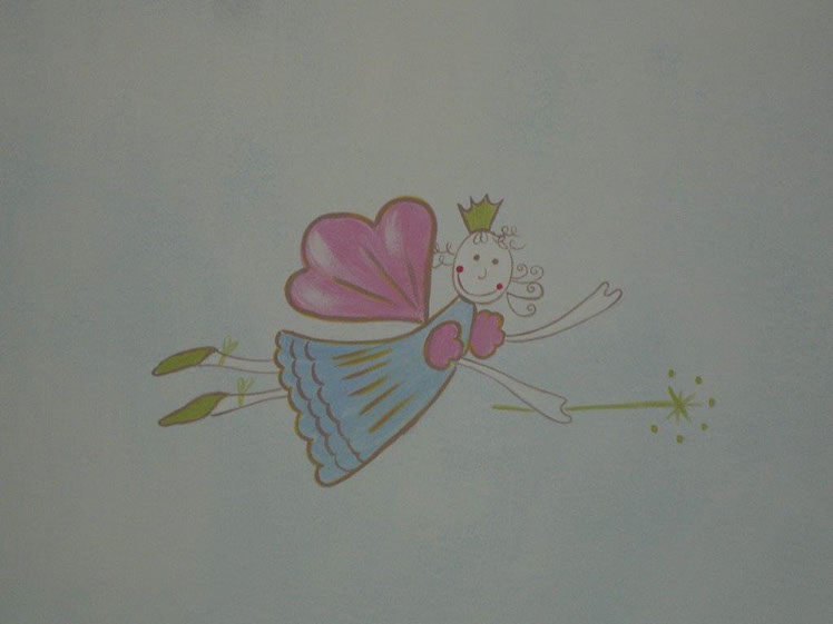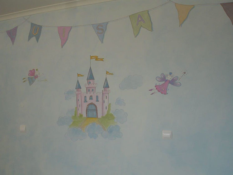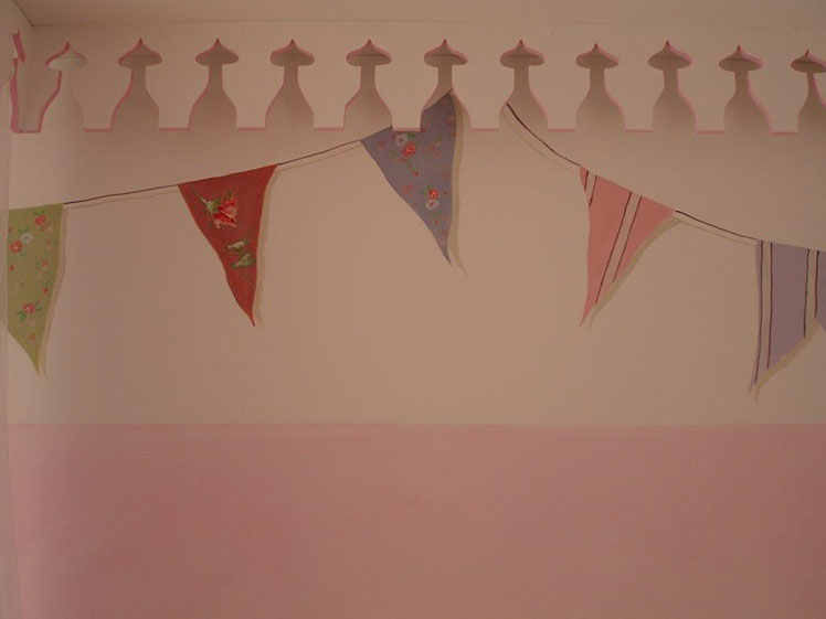 The starting point for this room were the bedcovers which had these fairies and castles applied in patchwork. From here I went on to paint a sky with clouds and a castle on each of the walls and fairies flying over coloured flags which bear the names of the two sisters who own this enchanted kingdom! They each have their own kingdom and their own castle.
