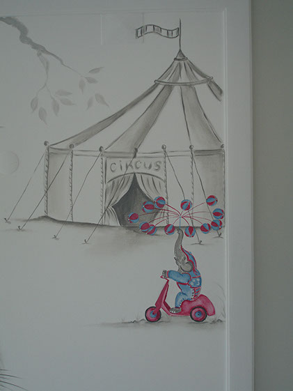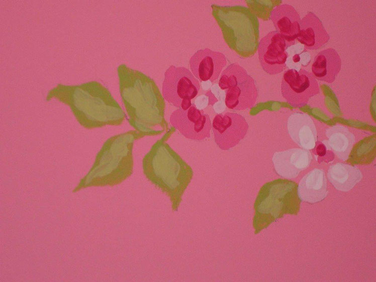 In this babys room I was asked to paint a tree in pinks and beijes, the same colours that already existed in the walls and wallpaper. The result as a very harmonious ensemble of gentle pastel colours. It s very much a real little girls room like the ones in fairy tales.