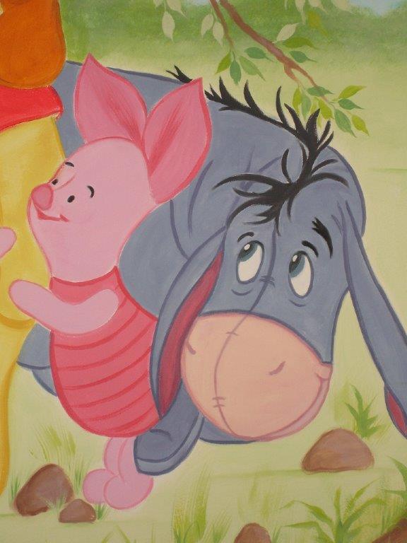 Neste quarto pintei o Winnie, e alguns dos seus grandes amigos e companheiros de tantas aventuras: o Tigger, o Piglet, e o Eeyore. Aqui eles estão os 4 abraçados e contentes debaixo de uma grande arvore, até o Eeyore( o burro) está a rir, um verdadeiro hino á amizade.