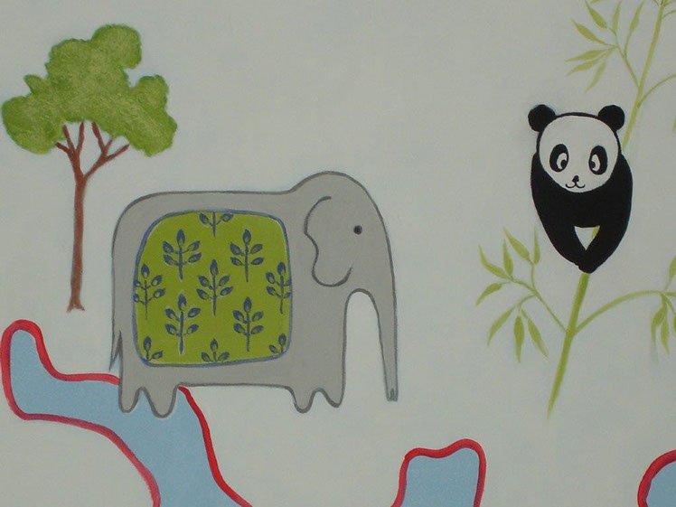 In this baby’s room my inspiration was the land of the rising sun, i.e. Japan: I thought of cherry blossoms, birds, silk, kimonos, etc. I painted the little birds with gay, vibrant colours over an ivory ground with gold-leafed cages and I added a few colourful butterflies and dragonflies.