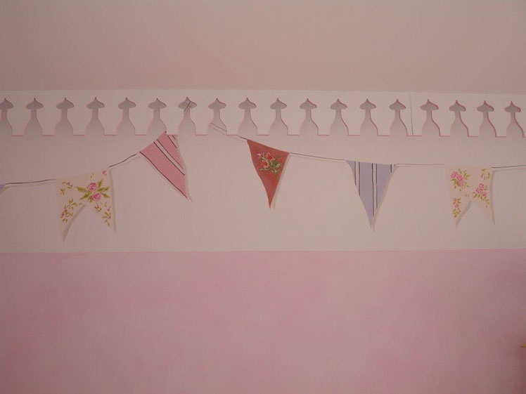 Here, the starting point was the patchwork bedcover, which provided the idea of the little flags painted in trompe loeil to match it. The cove around the ceiling and the canopy are reminiscent of fairy tale princesses rooms and so, too, is the stained light rose colour of the walls.
