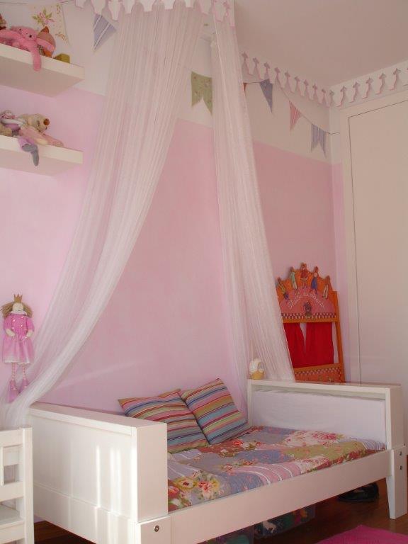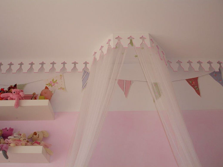 A sanca recortada em volta do quarto e o dossel com mosquiteiro remetem-nos para os quartos de princesas dos contos de fadas, assim como a escolha do manchado em cor-de-rosa claro das paredes.