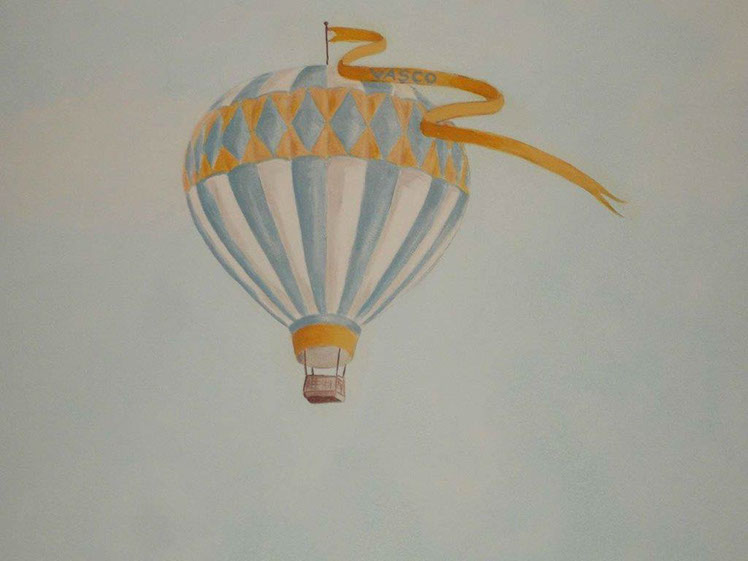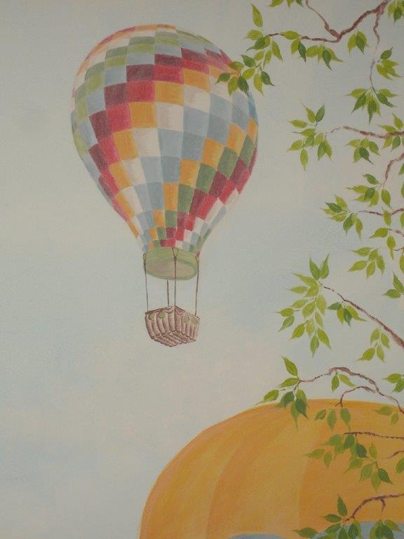 Neste quarto de rapaz, resolvi pintar um cenário com coelhinhos, passarinhos nos ramos de duas grandes árvores que nascem em cada canto da parede e um céu cheio de balões de ar quente coloridos e todos diferentes. O resultado final, apesar de ter um ar um bocadinho retro, é lindo! Tenho a certeza que o dono deste quarto vai adorar dormir aqui e sonhar com uma viagem de balão á volta do mundo!