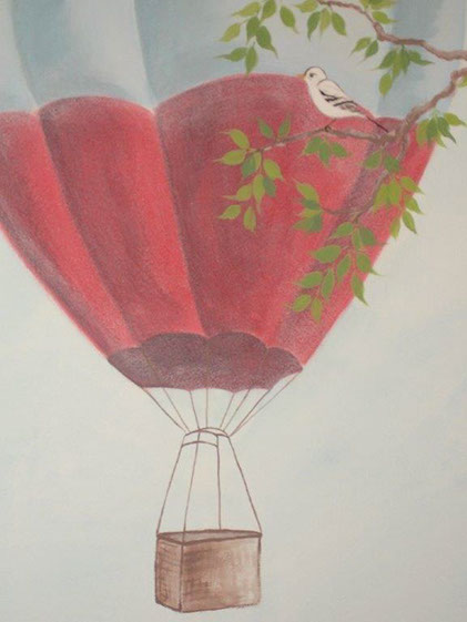 The project is Catherine Cabrals who asked me to paint a fountain in a garden using only greys and one little bird in colour so as to create a different atmosphere in a babys room. The result is patent and we can imagine we are sitting