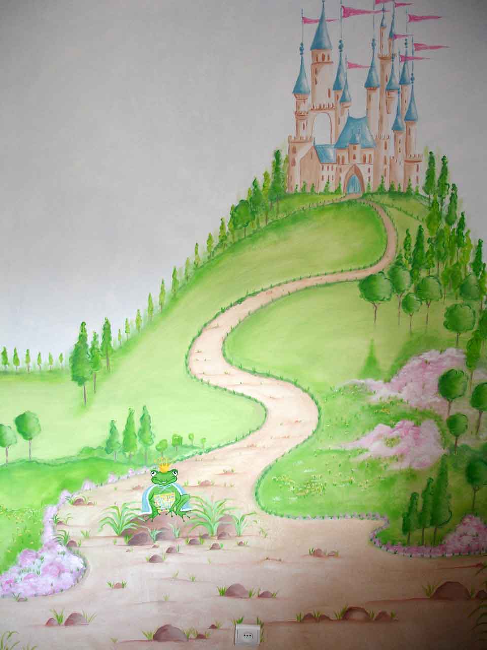 A pedido da dona do quarto, uma menina de 6 anos, pintei na zona de dormir um castelo de princesas! O caminho nasce na zona da cabeceira da cama e vai até ao cimo do monte onde fica o castelo rodeado de árvores e com um bosque na encosta. Em cima de uma pedra em 1º plano vê – se um sapo com uma tabuleta que diz “sou um príncipe encantado! “Achei que este cenário não ficava completo se não tivesse pelo menos um príncipe encantado transformado em sapo!