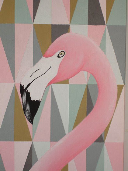 Este projecto é da Catherine Cabral, e a ideia dela quando me pediu para pintar esta fonte num jardim só com cinzentos e com um passarinho a cores, foi de criar um ambiente diferente num quarto de bebé. O resultado está á vista, e quase podemos imaginar-nos num banquinho de jardim a ouvir o barulho da água e o cantar do passarinho.
