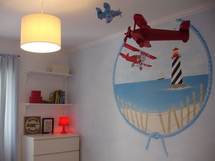 Um farol, um veleiro ao longe e um aeroplano numa praia, tudo dentro de uma moldura de corda grossa a fazer lembrar um estilo muito navy, foi o que eu me propus pintar neste quarto de rapaz. Tudo isto num fundo de nuvens muito suaves, capazes de fazer sonhar qualquer marinheiro ou aviador que se preze!