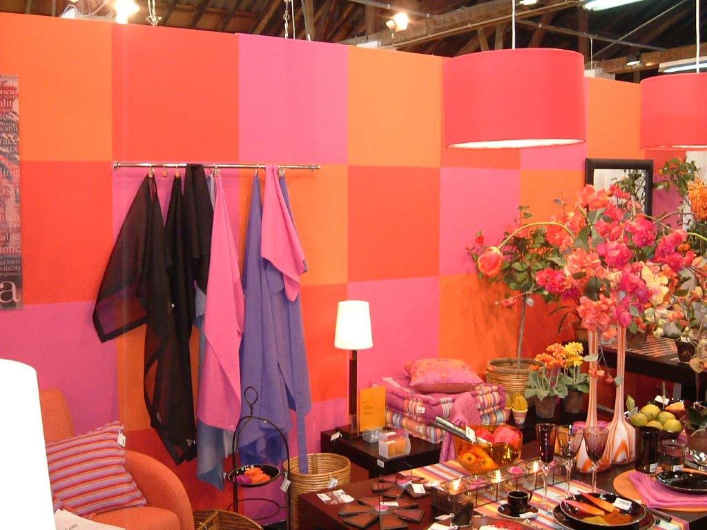Here, there is an Indian fairy tale atmosphere created by the chosen motifs painted in white over the warm pink and orange backgrounds reminiscent of far-away places.